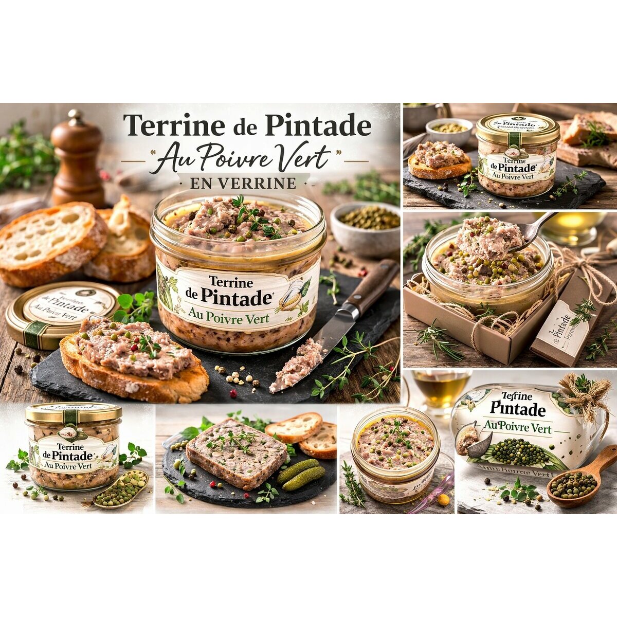 Made from French organic guinea fowl (59%), this delicately textured terrine combines premium ingredients with a subtle touch of green peppercorn (0.5%), bringing a refined aromatic finish.